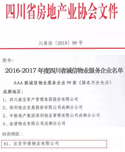 “2016-2017年度四川省诚信物业服务企业AAA级”荣誉称号