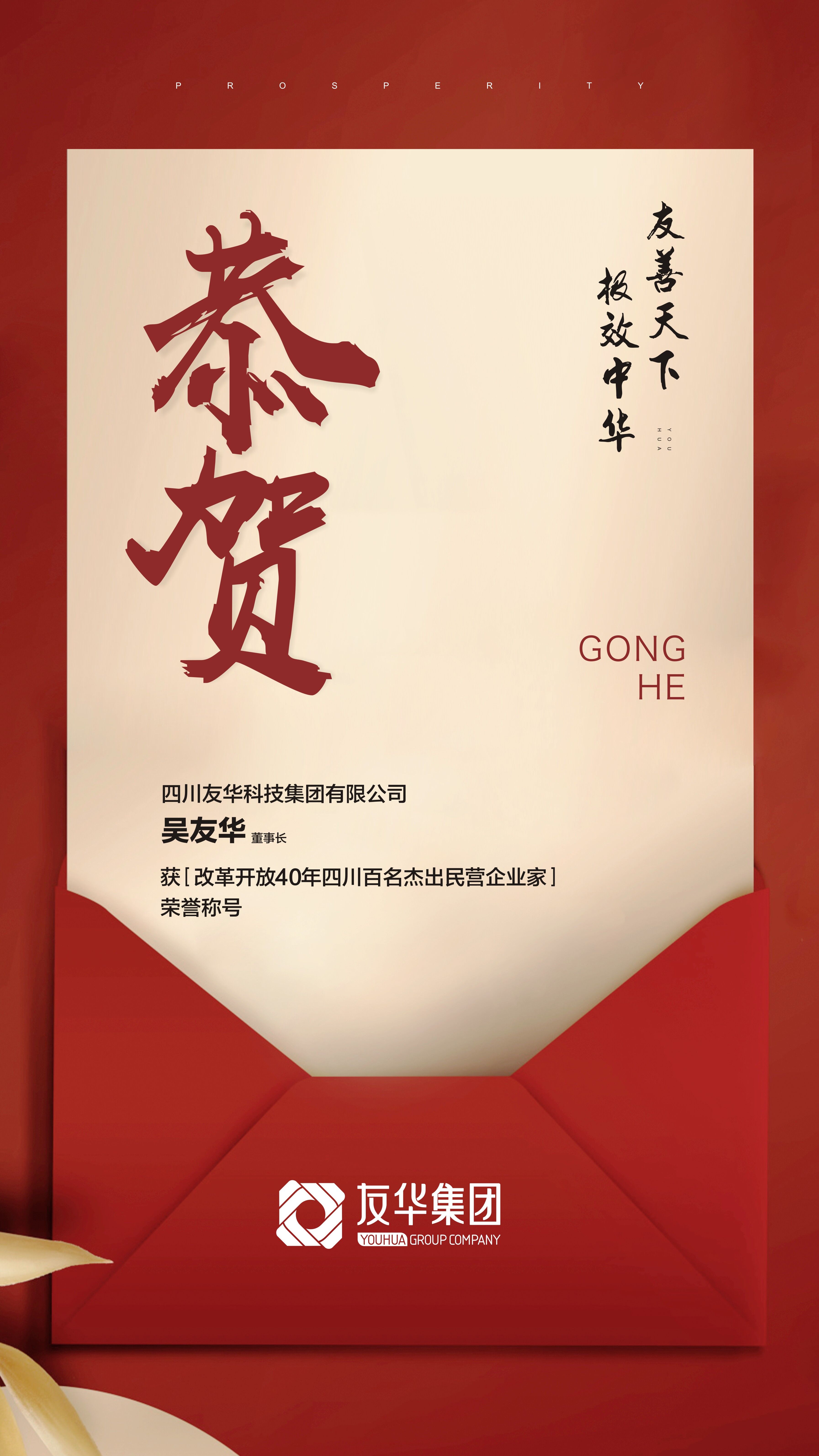 12月7日,省委统战部、省工商联主办的“四川民营企业庆祝改革开放40年盛会”在成都举行。大会发布了“改革开放40年四川百名杰出民营企业家”名单。集团董事长吴友华获此殊荣!