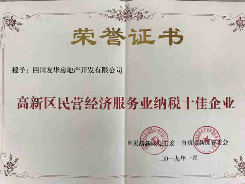 2019年1月22日上午,自贡市高新区党工委、自贡高新区管委会对2018年度纳税先进企业进行了表彰。四川友华房地产开发有限公司荣获“高新区民营经济服务业纳税十佳企业”称号。