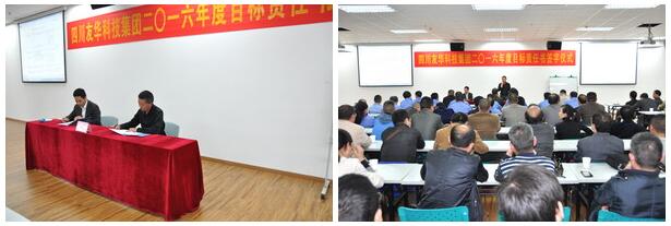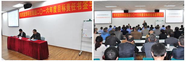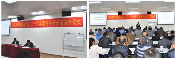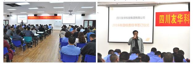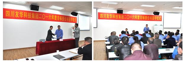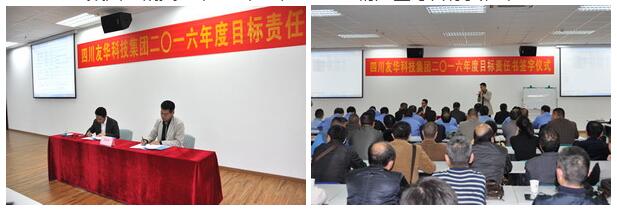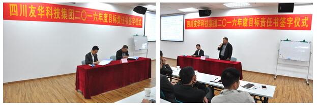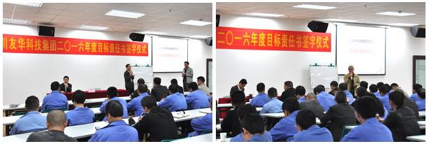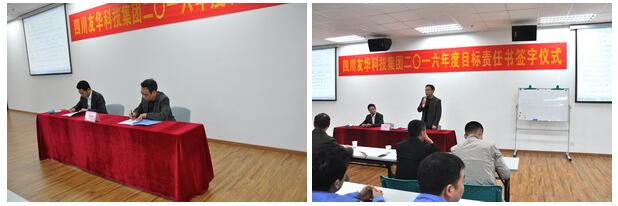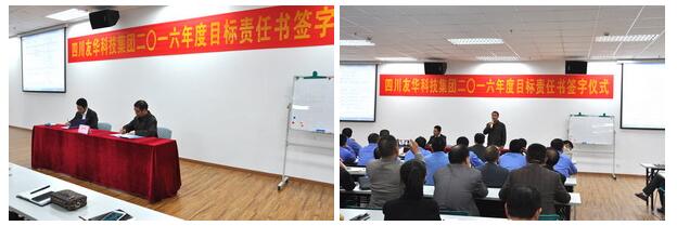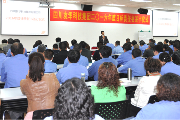 2016年是经济形势十分艰难的一年,友华科技集团上下一心,攻坚克难,同时聘请专业咨询顾问,为公司进行诊断分析,寻求新的战略发展机遇、调整重点实施策略,并于4月6日举行2016年度目标责任书签字仪式,由集团与各所属公司分别签订2016年经营目标责任书。会议由集团副总裁乔路良主持,全集团中层以上管理干部参加了签字仪式。各所属公司总经理代表所负责的公司与集团总裁吴友华先生在责任书上签字,并对签订的经营目标做了充满信心的发言。集团分管房产板块的总裁助理白新民以及房产公司副总经理罗建新、杨忠在会上也做了精彩发言。最后,吴友华总裁作了重要讲话,吴总指出:今年的经营目标制定相比往年更加准确,更具系统性、科学性,同时要求建立总裁信箱,欢迎全体员工就公司生产经营的问题,提出宝贵意见和建议。